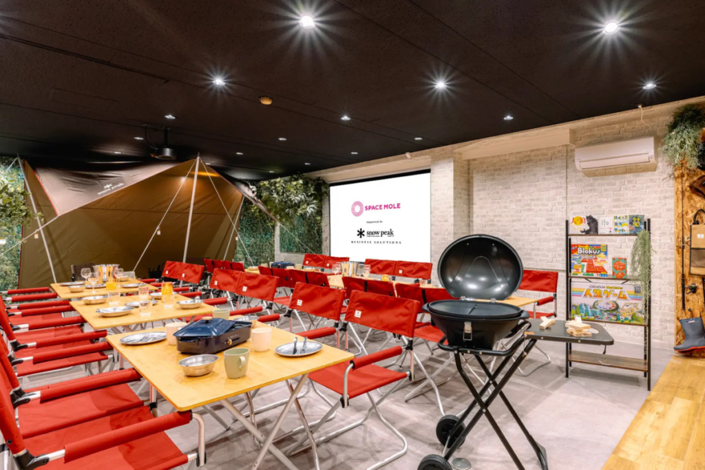 立地がとてもよく、Snow Peak(スノーピーク)の大人気キャンプ用品が設置されている屋内キャンプスペースです。