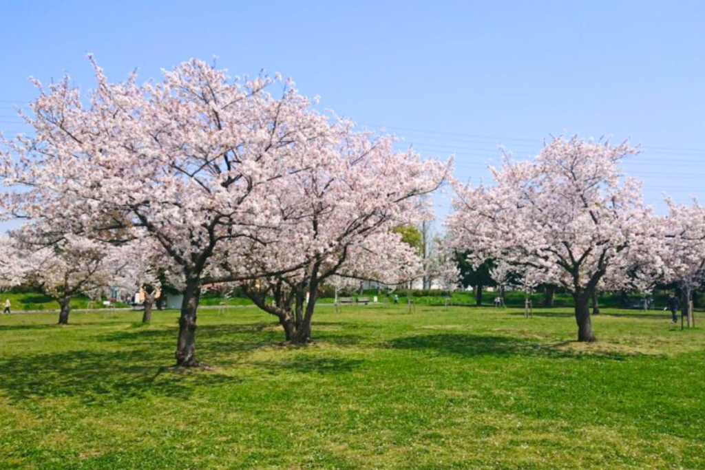 - 満開時はピクニックやバーベキューをする人々で賑わっています(桜広場)