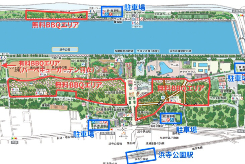 浜寺公園は縦に長い地形になっており、無料BBQエリアも縦に範囲は広めになっています。