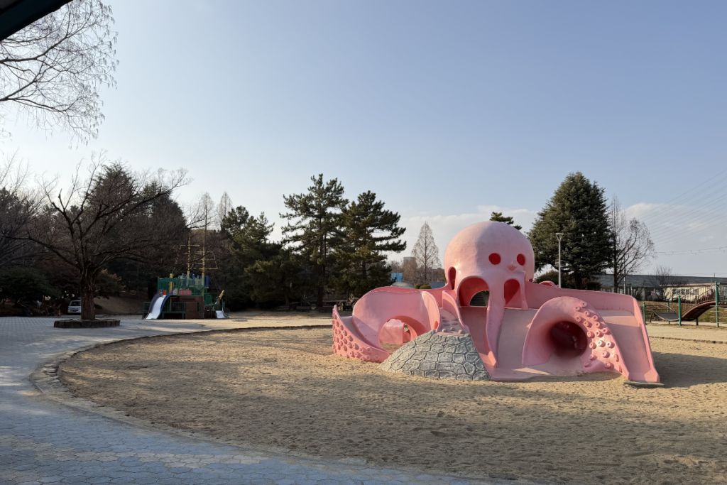 大型遊具、まるで船のような遊具、大きなタコの滑り台、ターザンロープなどもあり、子供たちはたっぷり遊ぶことができます。