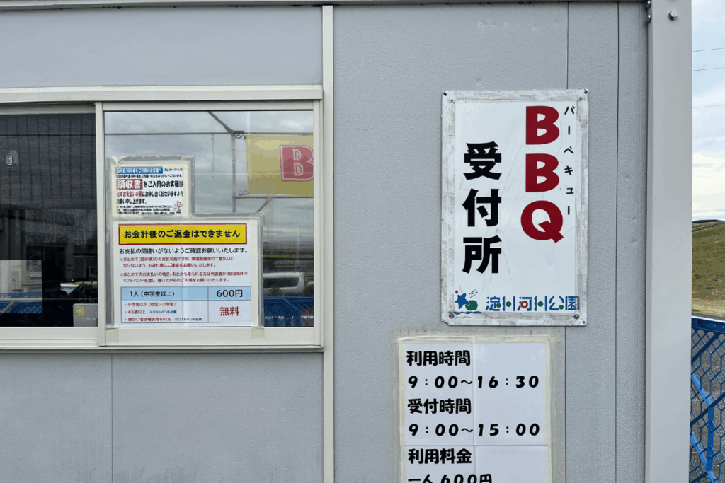河川敷に降りるとBBQ受付所があり、ここで予約名を伝え利用料金を支払います。