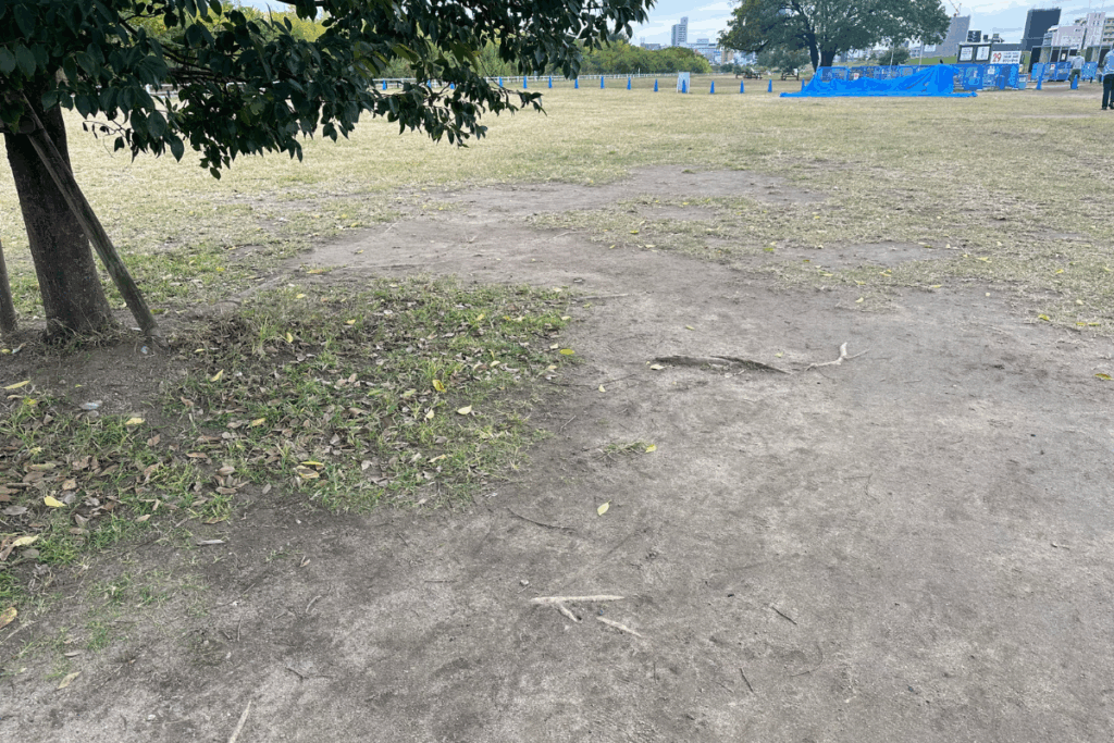 淀川河川敷の地面ですが、水はけが悪いため雨が降ると簡単に水たまりができます。