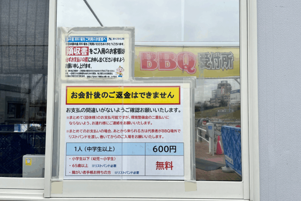 今回私たちはレンタルBBQを予約して行きましたが、機材を持参して個人でBBQエリアを利用する場合にも利用料金600円/1人が必要でした。